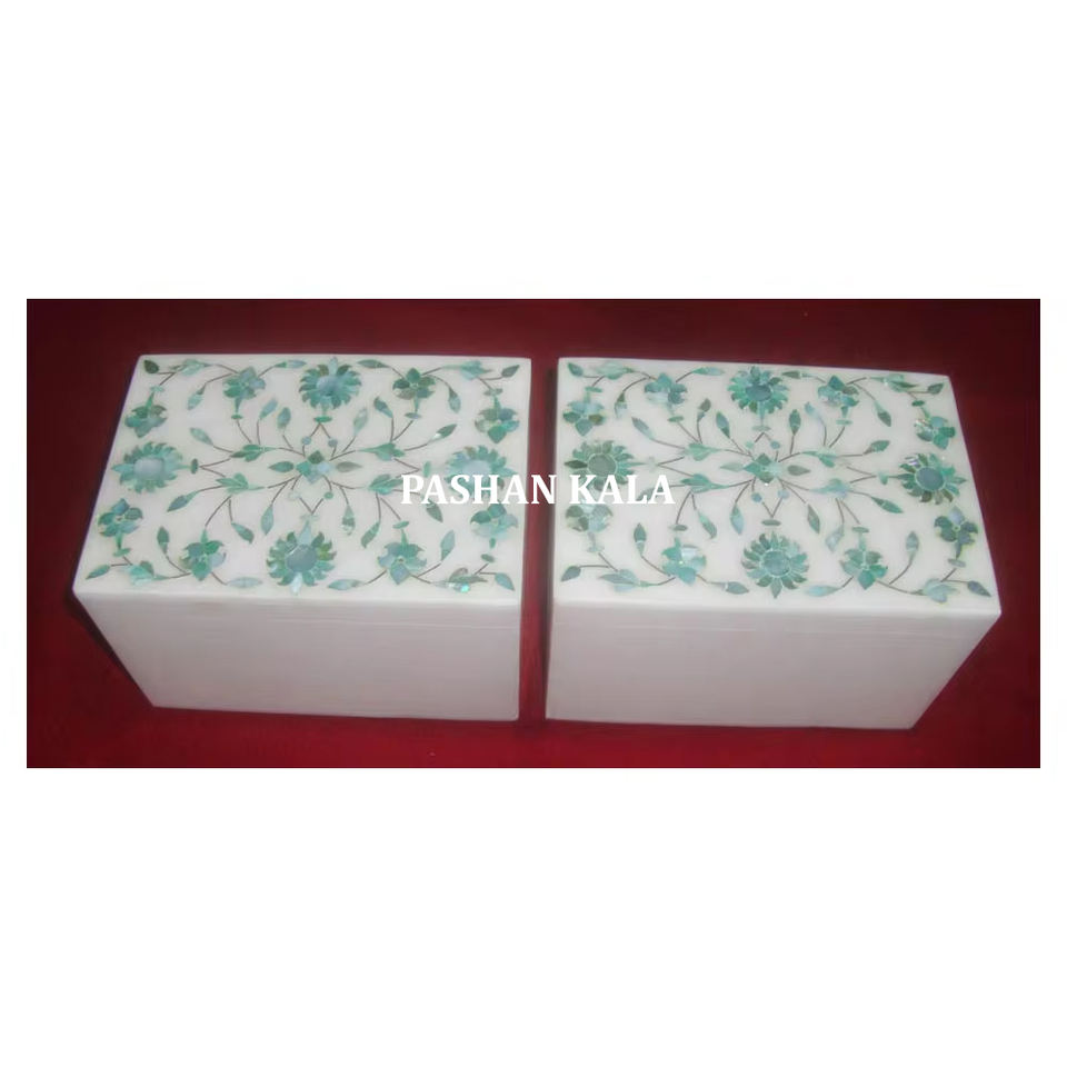 Hermosa caja de almacenamiento de joyas hecha a mano con incrustaciones de mármol blanco y diseño floral de nácar verde para regalo.