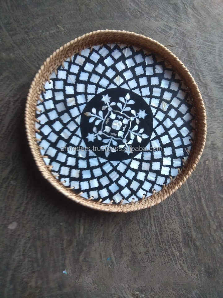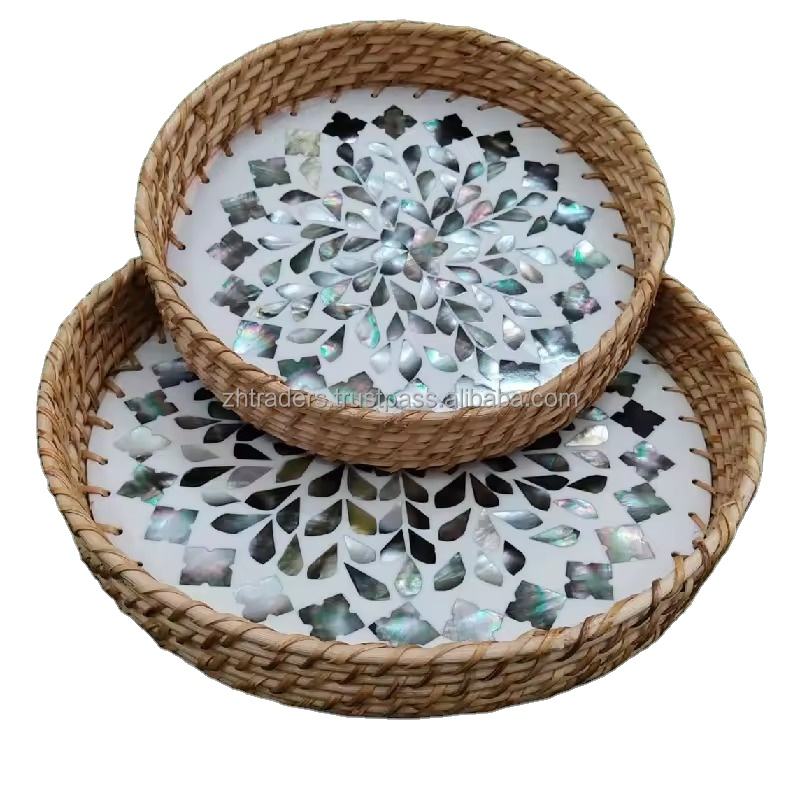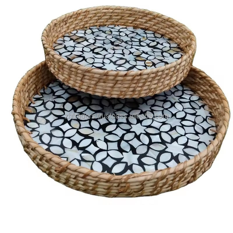 Hermoso juego de bandejas redondas de ratán tejidas a mano, asequibles y adornadas con Incrustaciones de nácar, ideales para regalos de restaurantes y hoteles
