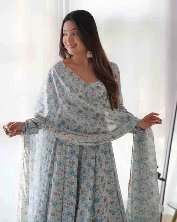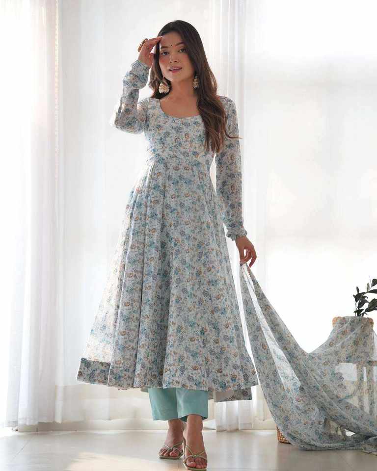 Hermoso Vestido Anarkali de Gasa con Estampado Floral para Mujer, con un Elegante Corte Largo y Amplio para Festivales y Bodas
