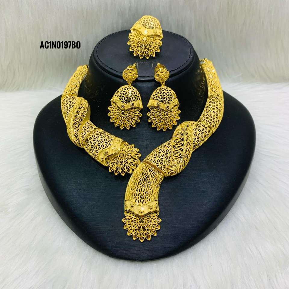 Hermoso conjunto de collar corto de último diseño con pendientes y anillos, joyería de un gramo chapada en oro de 18 quilates para mujer