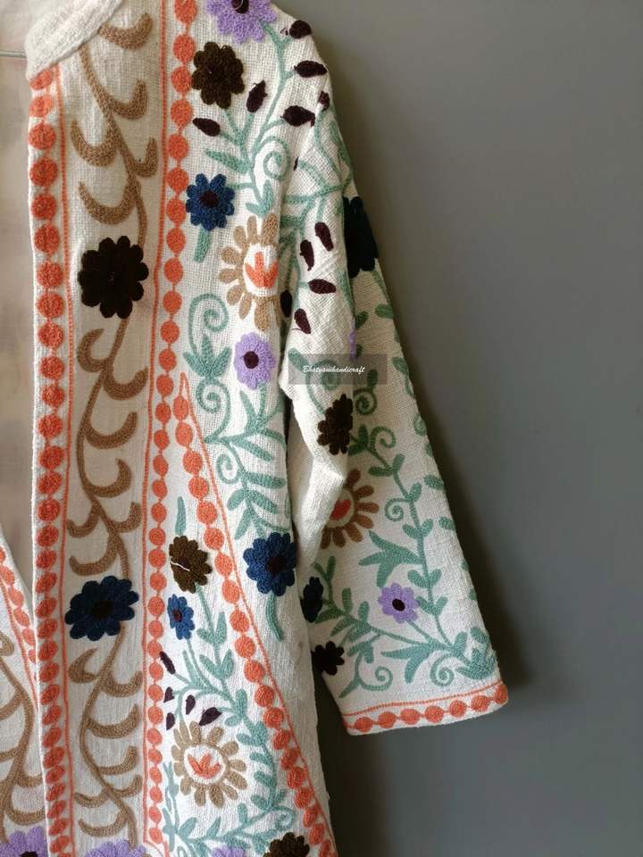 Hermoso abrigo largo de invierno bordado a mano chaqueta Suzani acolchada para mujer Vestido de playa de longitud corta relleno de algodón tejido