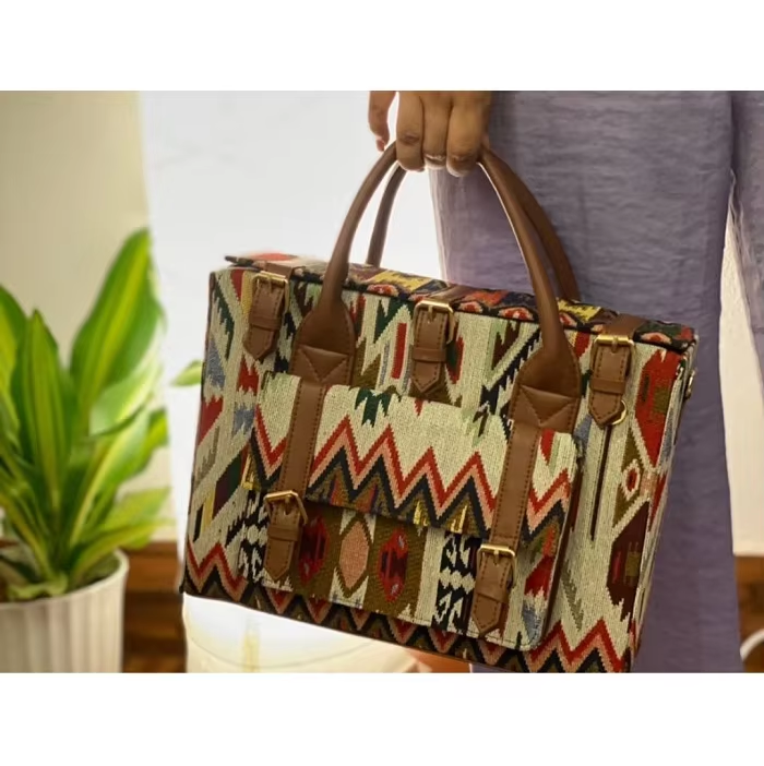Hermoso bolso de diseñador multicolor para mujer con llamativas combinaciones de colores y líneas elegantes