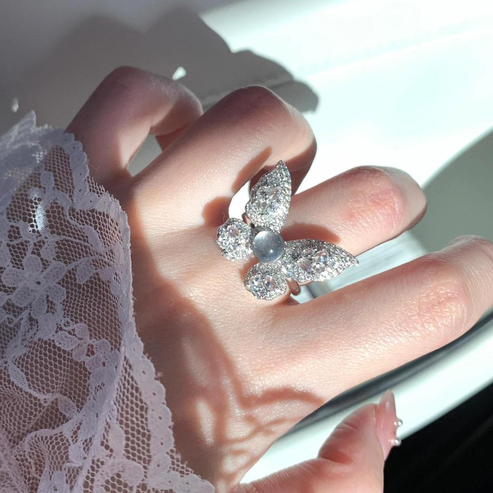 Hermoso Anillo Abierto de Plata de Ley S925 con Incrustaciones de Diamantes, Diseño de Mariposa Flotante de Jade de Agua China