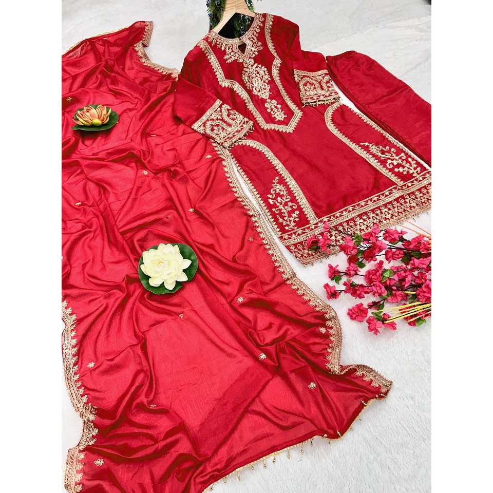 Hermoso Conjunto de Salwar Kameez Rojo de Poliéster con Top, Pantalón y Dupatta Elegante para Fiestas, Talla L, Kavya Fab