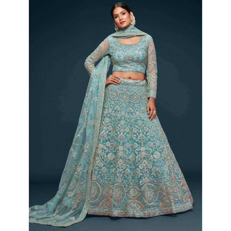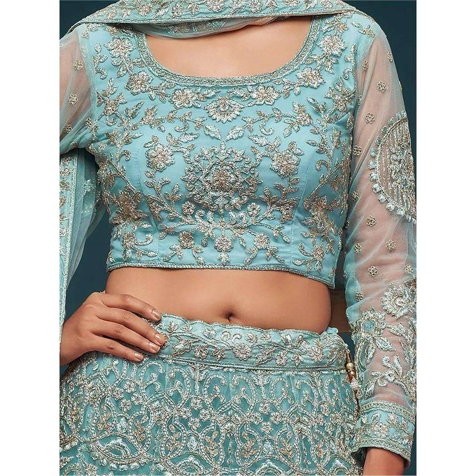 Hermoso mar azul bordado suave red Lehenga Choli con Dupatta
