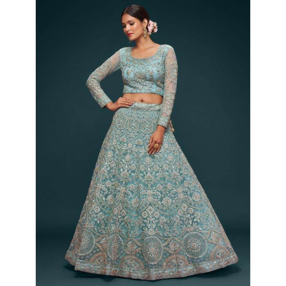 Hermoso mar azul bordado suave red Lehenga Choli con Dupatta