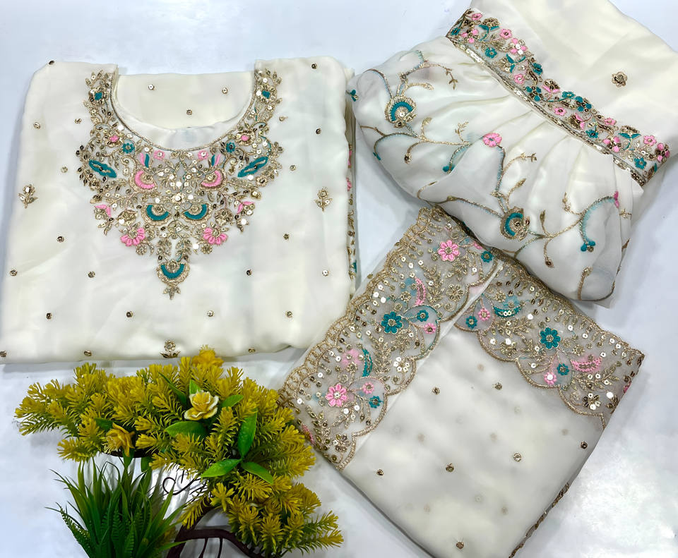 Hermoso conjunto de Kurti de georgette con bordado de lentejuelas e hilos, Sharara de georgette completamente cosida y Dupatta de georgette.