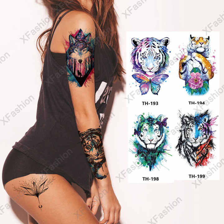 Hermosos dibujos de arte corporal Sexy Tigre animales transferencia de agua mangas de brazo pierna pecho temporal tatuaje negro flores para mujeres