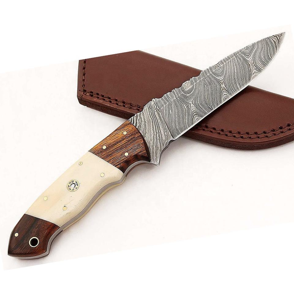 Hermoso cuchillo de hoja fija de acero de Damasco Sizzco para caza, Camping, cuchillo Skinner fácil de llevar, mango de hueso de camello de madera rosa, OEM