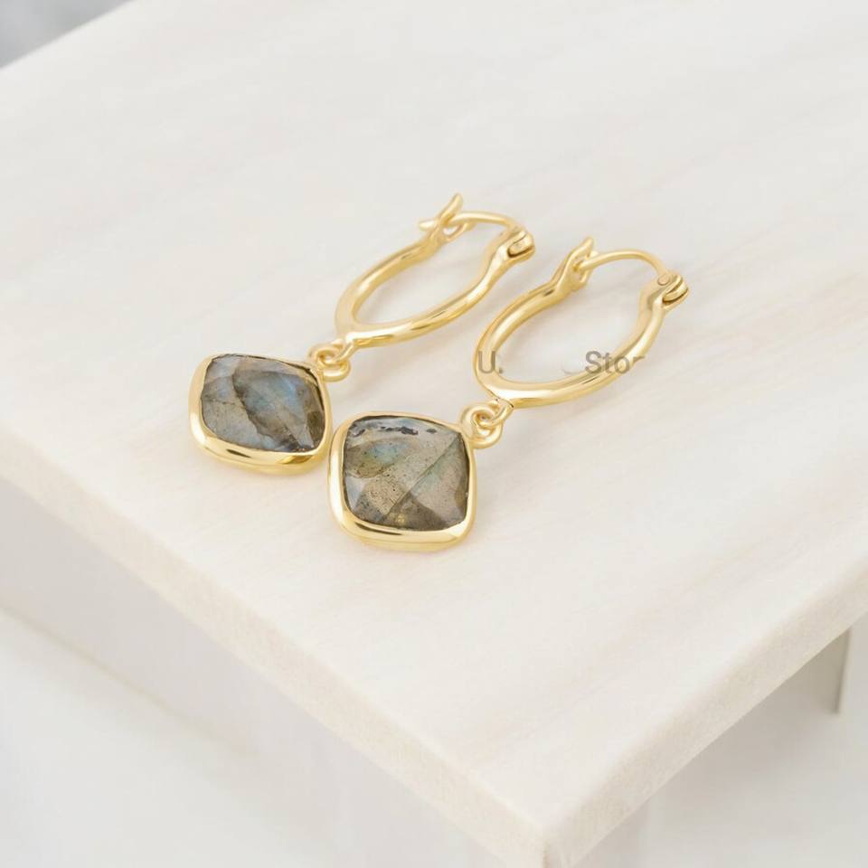 Hermosos y llamativos pendientes de gota de Plata de Ley 925 hechos a mano joyería de piedras preciosas de labradorita de fuego con chapado en oro