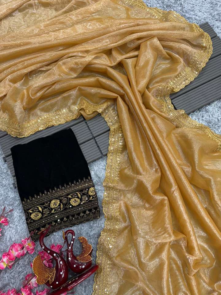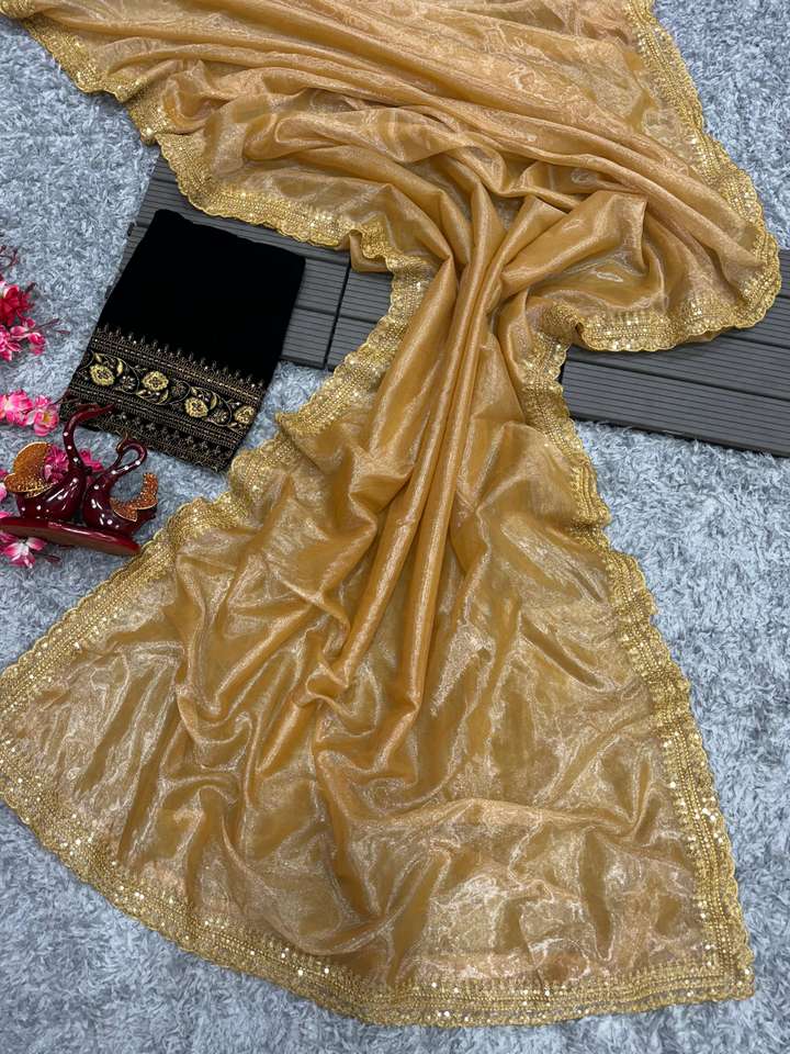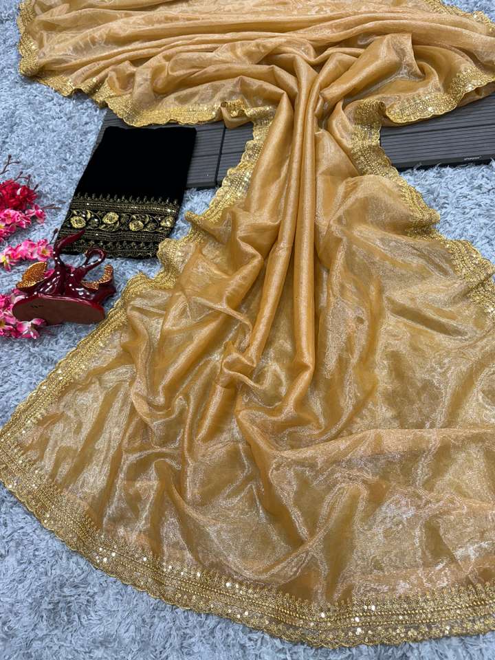 Hermoso Sari bordado de secuencia de red de sarga con blusa de terciopelo pesado 9000 con bordado de lentejuelas disponible al mejor precio