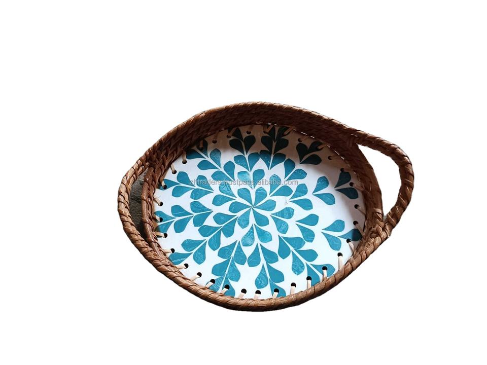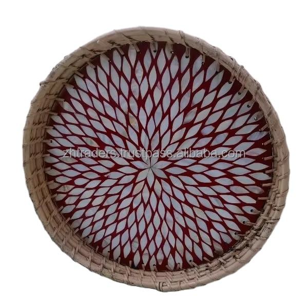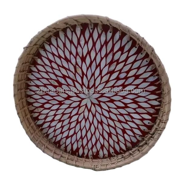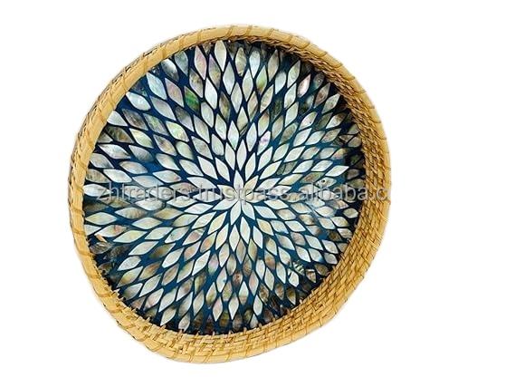 Juego de Bandejas de Servir de Ratán con Madreperla de Artesanos Indios Noor Saaj, Diseño Redondo Elegante para Té, Aperitivos y Presentación Festiva