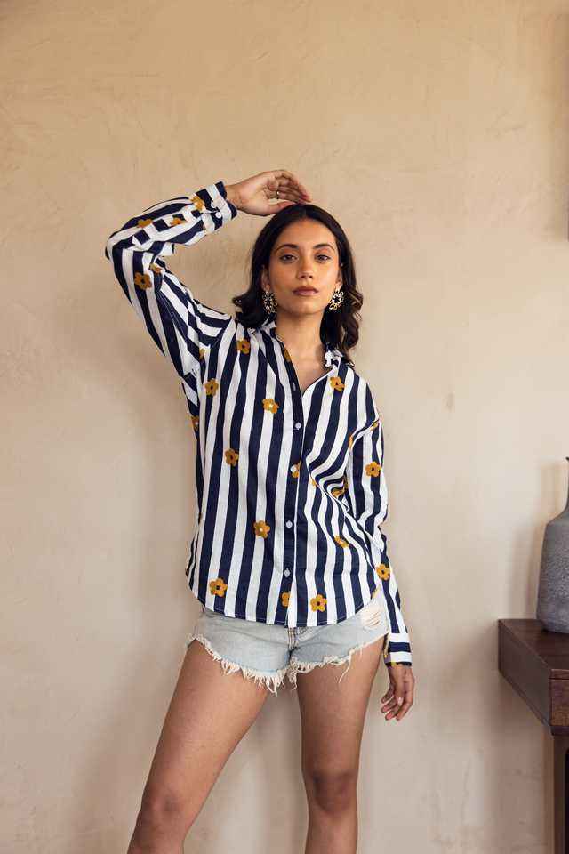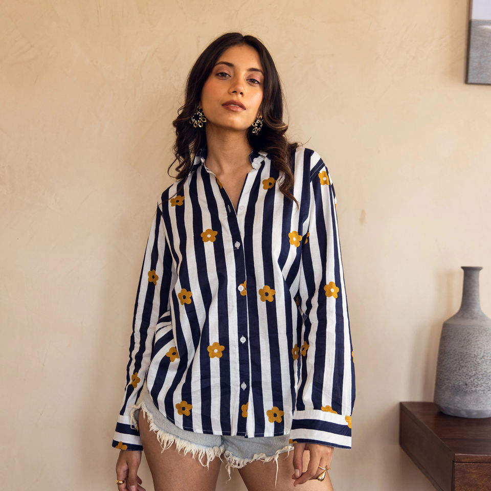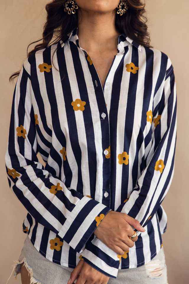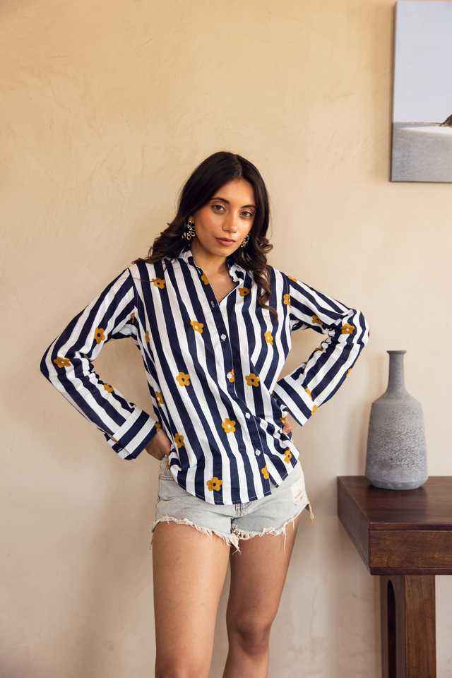 Camisa azul blanca informal bellamente impresa para mujer Ropa formal de algodón clásica elegante Tamaño de longitud corta Suministro ODM