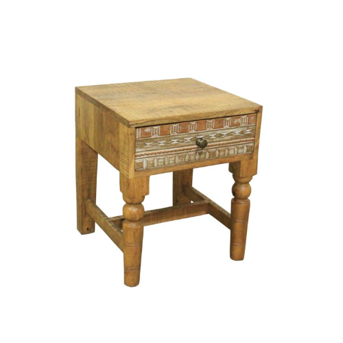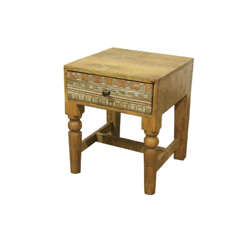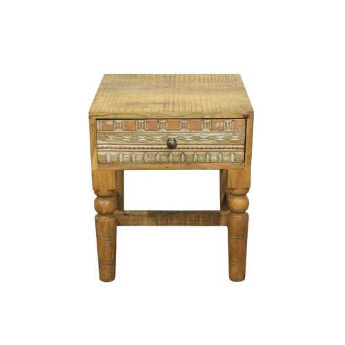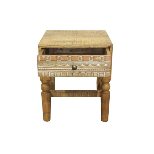 Mesita de noche, 1 cajón, madera maciza de mango, diseño tallado, natural y blanco, acabado desgastado, Parte posterior Mdf