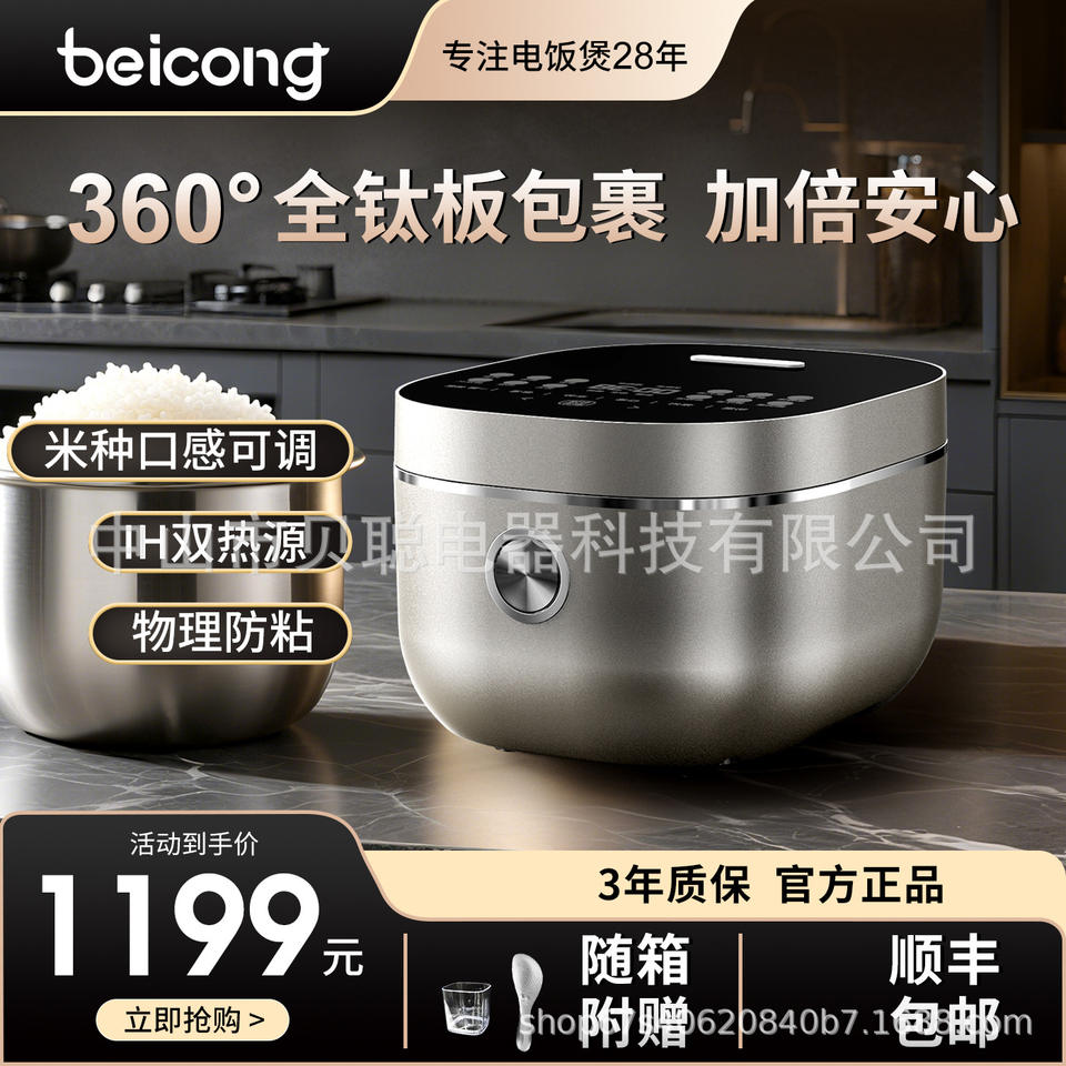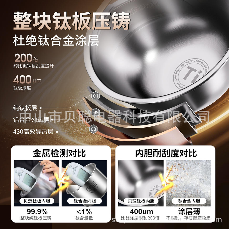 Olla Arrocera Beicong Ih de Titanio Puro de 4L, Forma de Tambor Inteligente, Acero Inoxidable, Color Champán, Eléctrica, con Función de Reserva