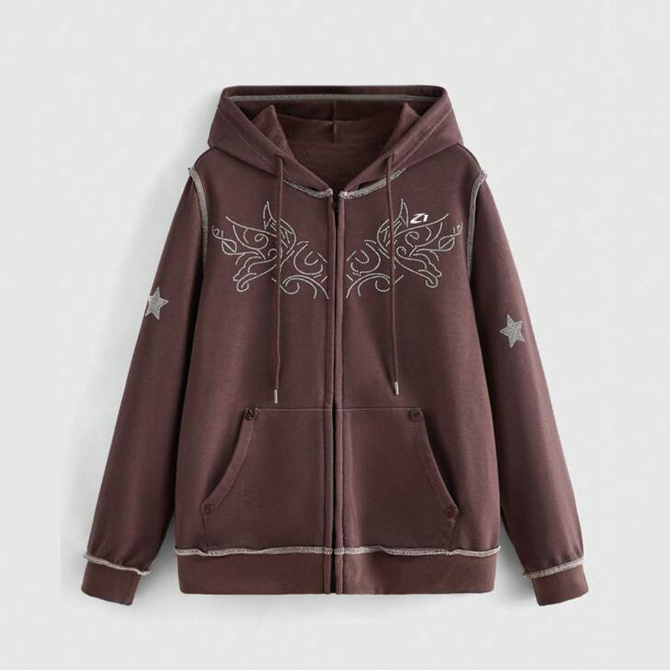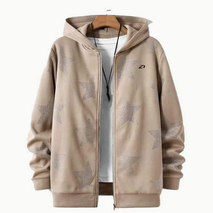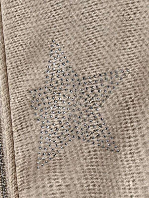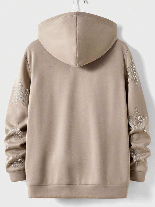 Sudadera con capucha de algodón polar beige con estrellas de diamantes de imitación en toda la superficie para hombre, estilo urbano minimalista, ropa de tono neutro, personalizable.