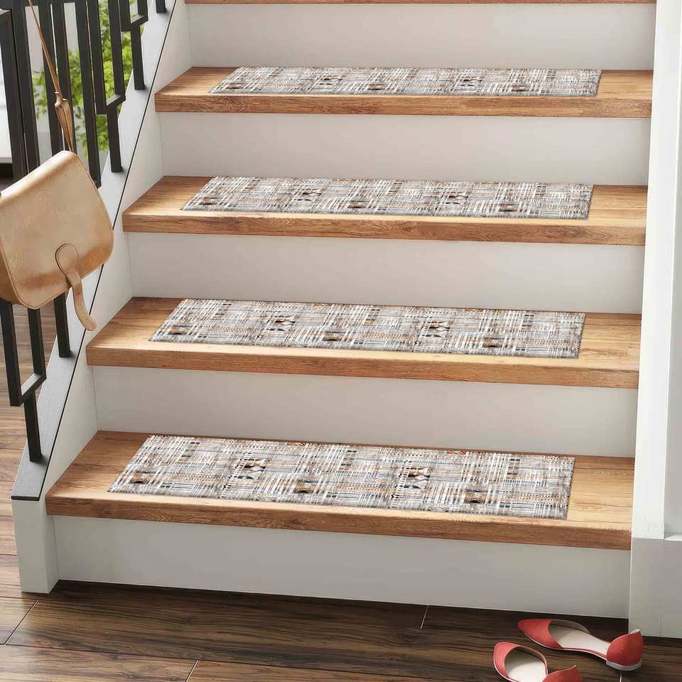 Alfombra beige boho estampada, alfombra moderna para escaleras en tonos suaves, gobelino