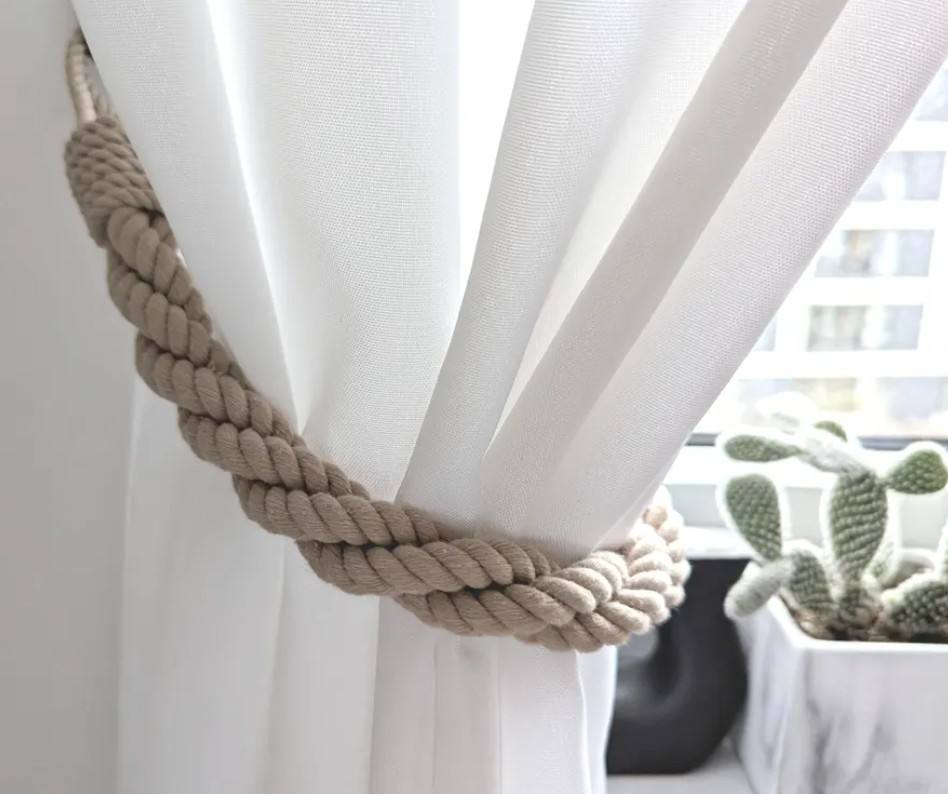 Beige Cotton Rope Curtain Tieback – Handmade Triple Twist Boho Holder