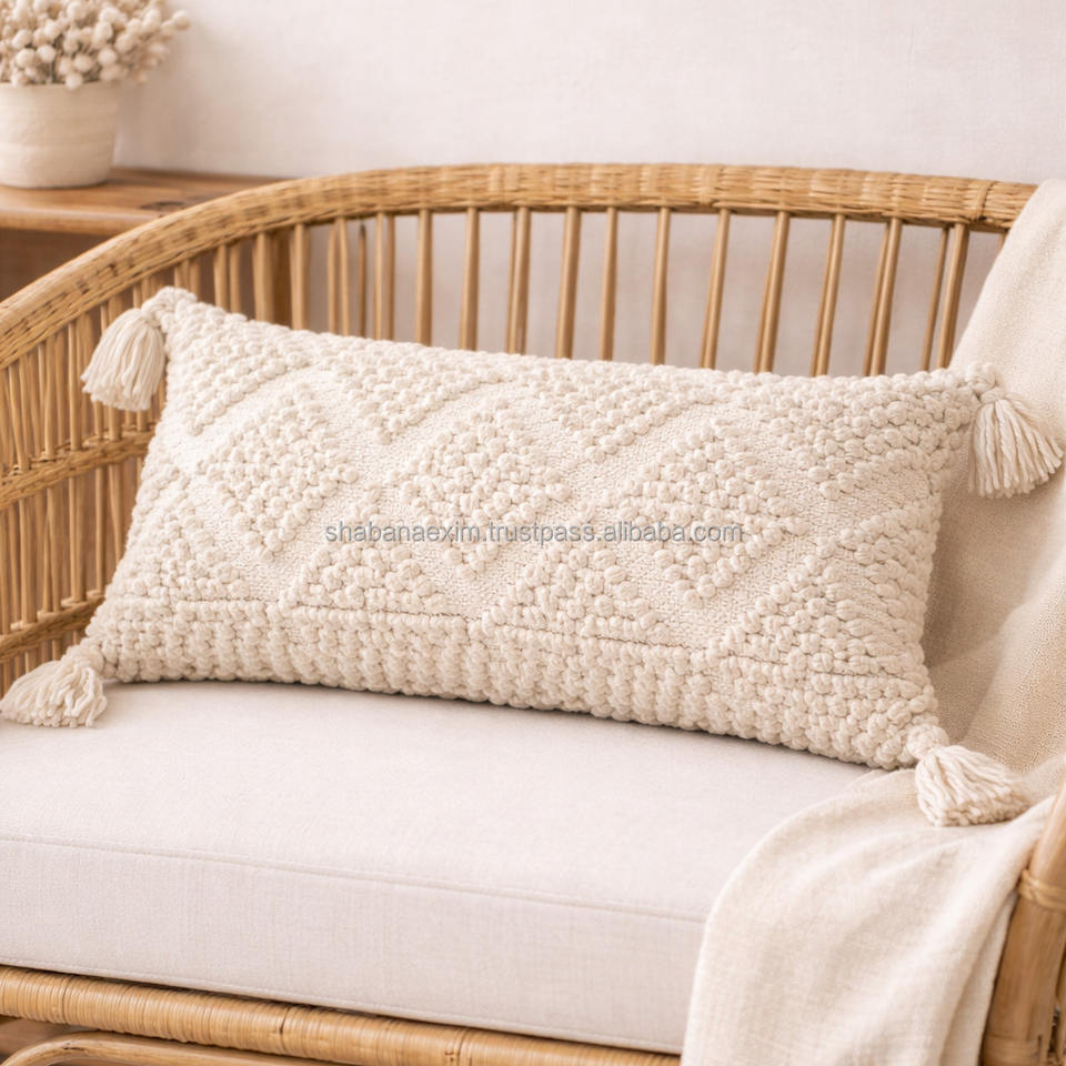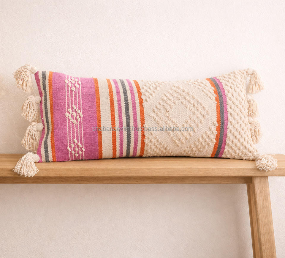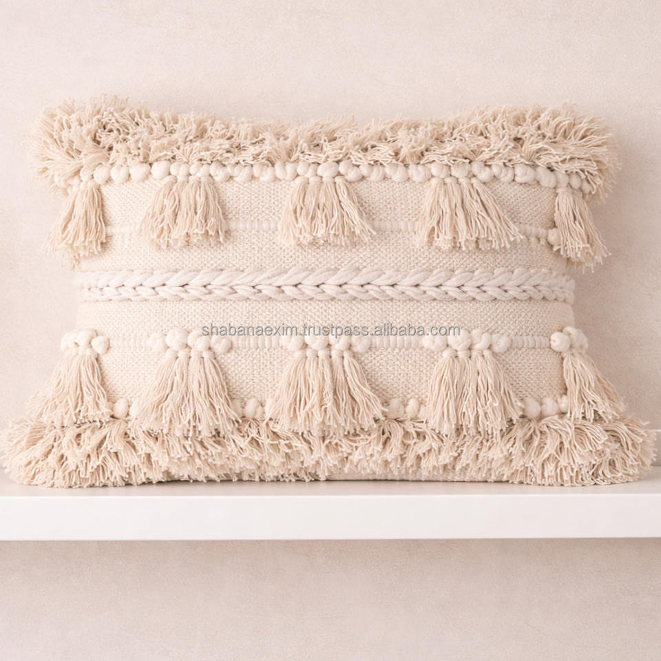 Funda de Cojín Boho Beige con Flecos Delanteros Múltiples, 30x50, Tejida a Mano, Natural, Funda de Cojín Boho Trenzada a Mano