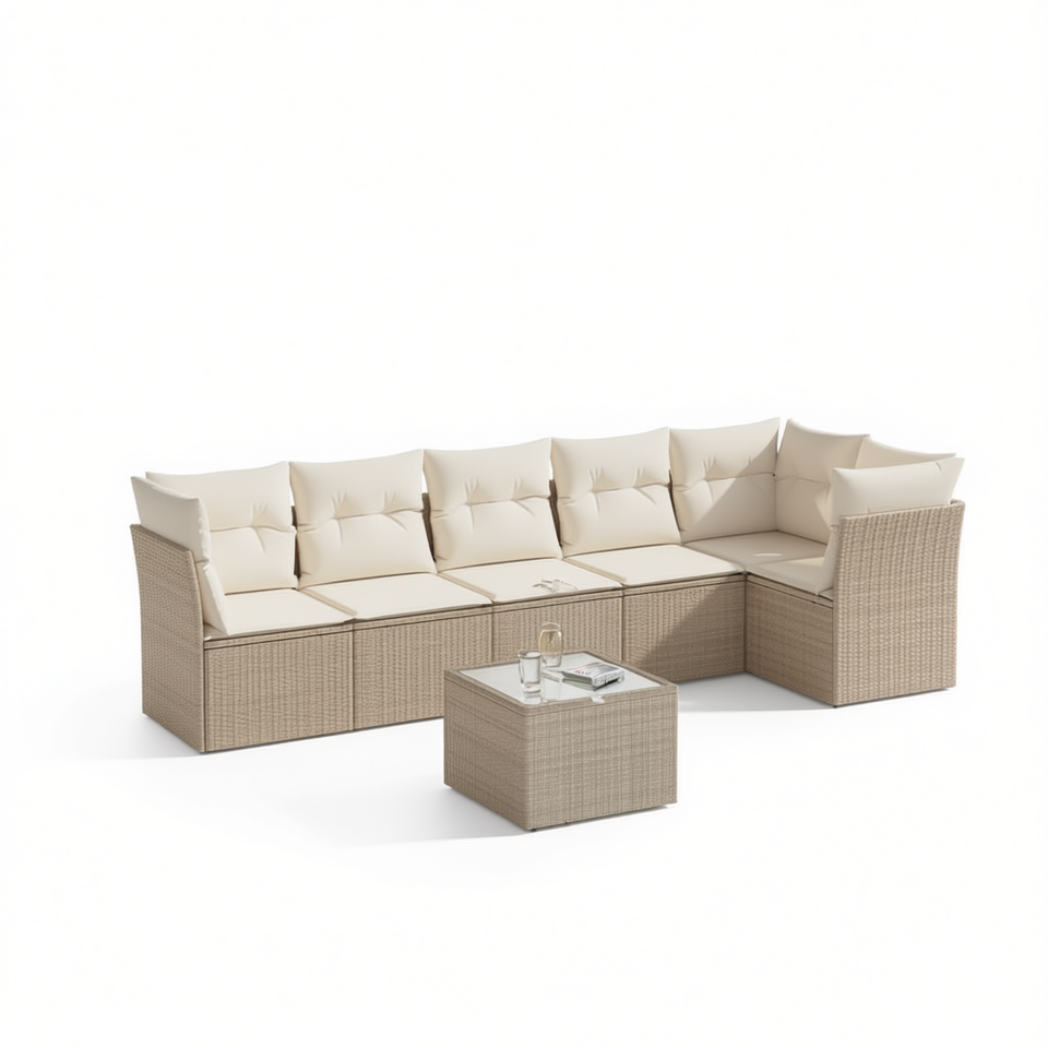 Conjunto de sofá de jardín de ratán sintético para 6 personas, muebles de exterior de diseño contemporáneo y duradero con estructura de acero y mesa de vidrio templado.