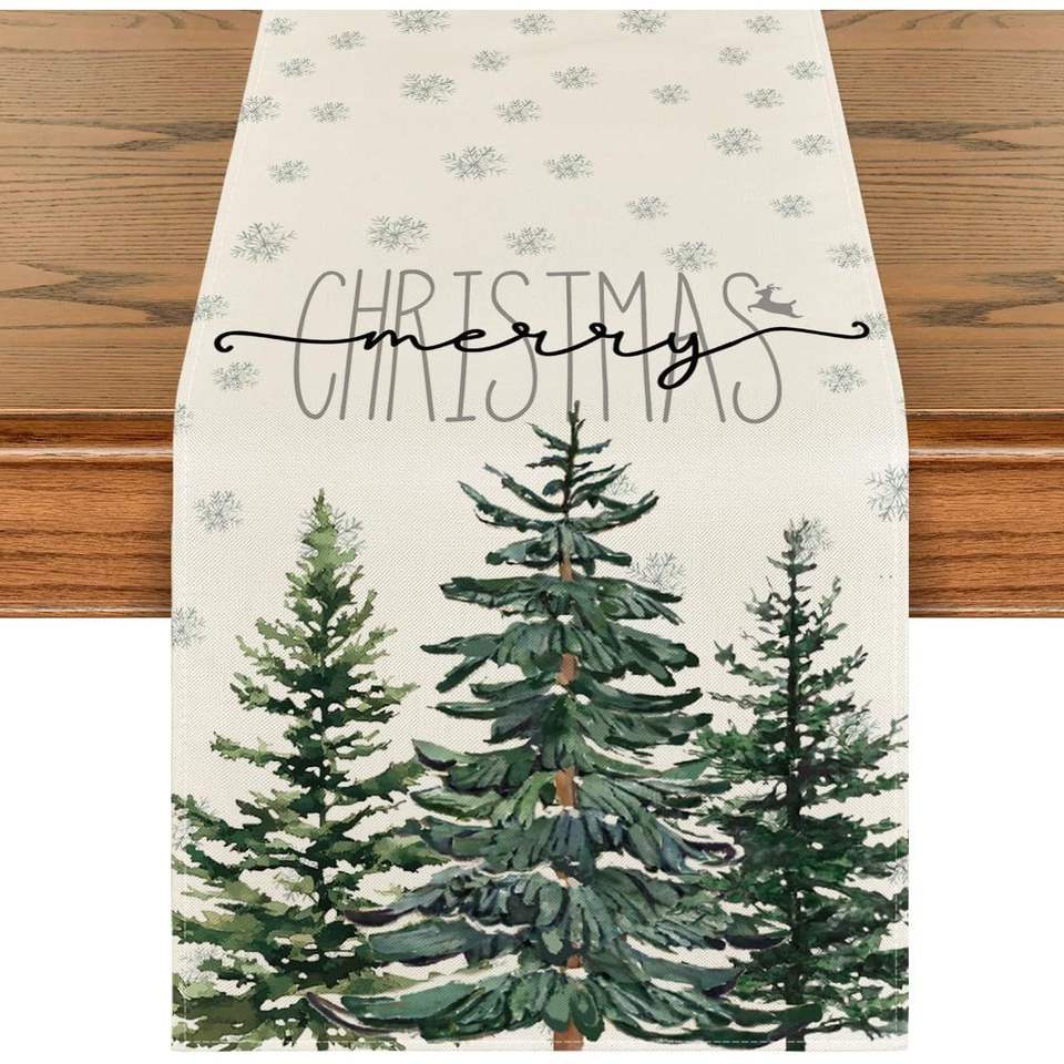 Camino de Mesa con Diseño de Copos de Nieve y Pinos Beige, Decoración Navideña para Mesa de Comedor, Cocina, Invierno, Navidad