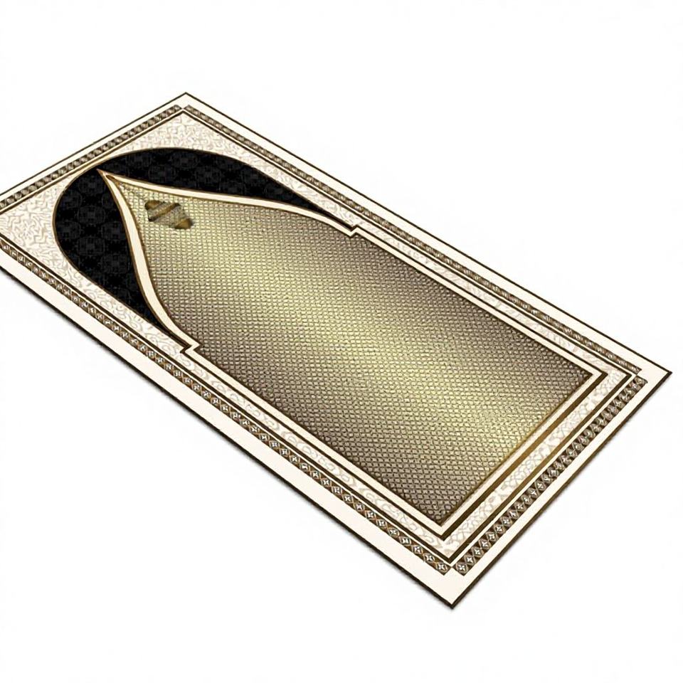 Alfombra de Oración Dorada con Diseño Islámico Elegante, Patrón de Patchwork de Lana Ecológica, Base de Látex Antideslizante, Grosor Medio