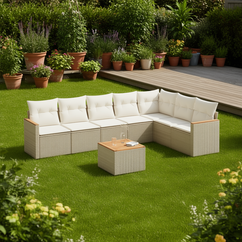 Conjunto de Sofá de Jardín de Ratán Beige con Cojines de Espuma de Alta Densidad, Muebles de Exterior de Diseño Contemporáneo, Resistentes al Agua y a los Rayos UV