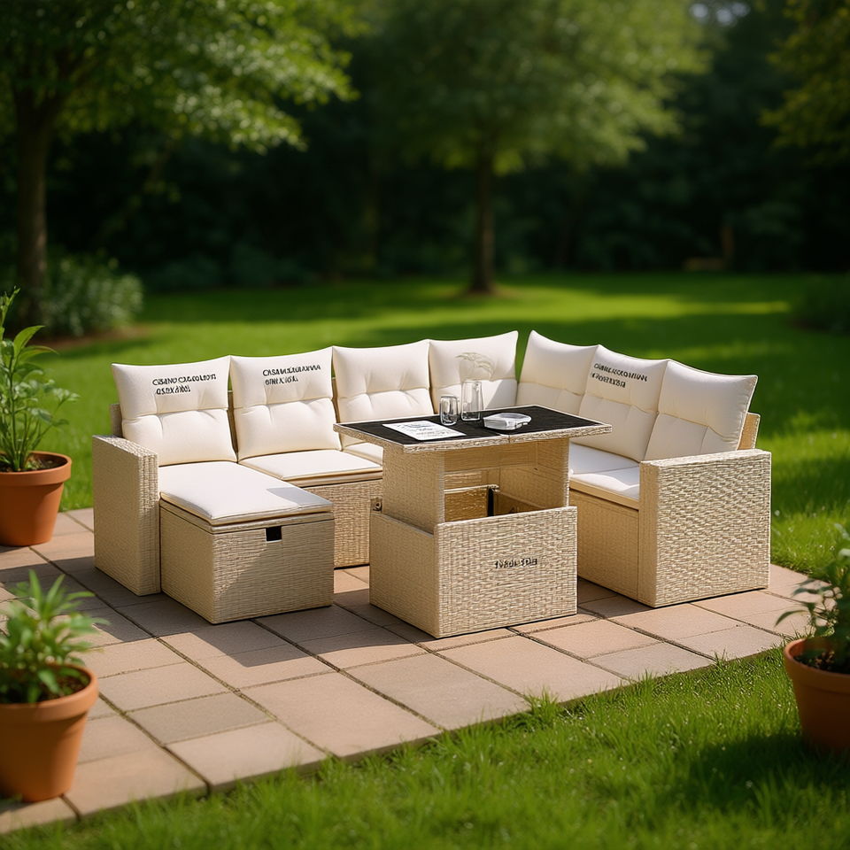 Conjunto de Sofá de Jardín de Ratán Beige con Mesa, 6 Plazas, Muebles de Exterior de Diseño Contemporáneo