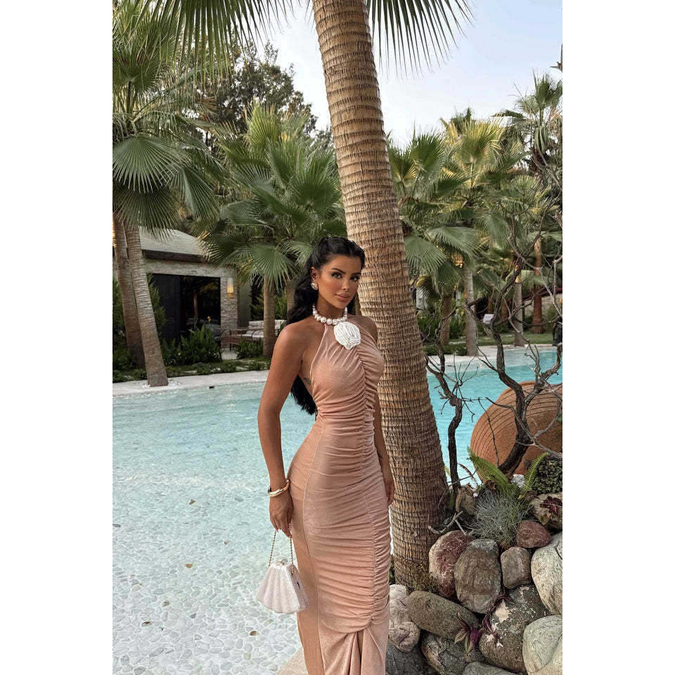 Vestido de Noche Beige Satinado con Detalle de Rosa, Talla XL, Estilo Atado, Tirantes Espagueti, Corte en A, Vestido de Fiesta Formal, Floral, Hecho de Rayón