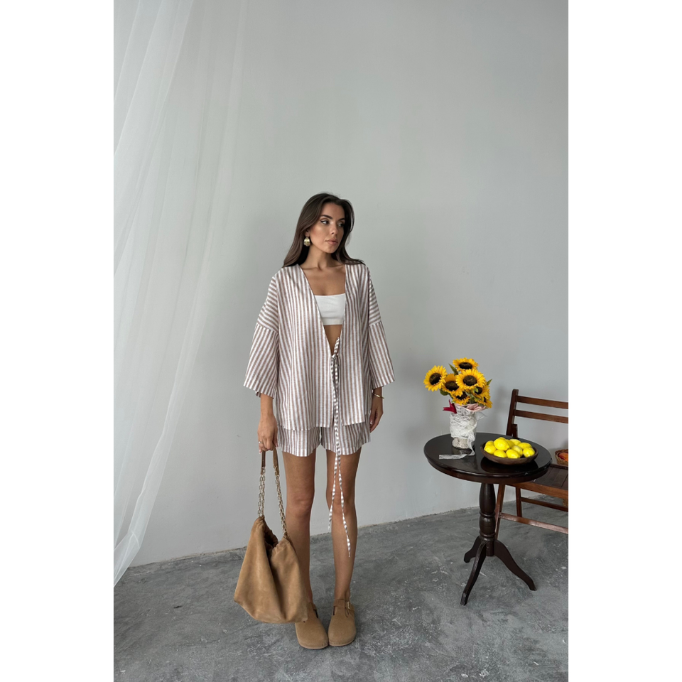 Conjunto de túnica y pantalones cortos a rayas beige, conjunto de verano para mujer, ropa informal holgada, talla S