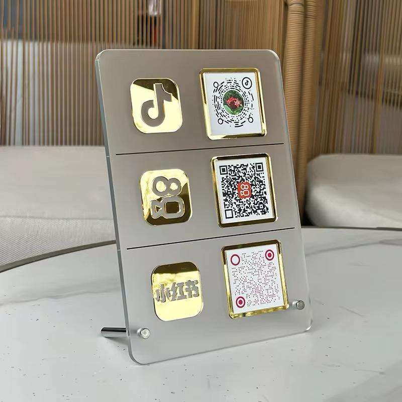 Expositor de Códigos QR de Acrílico Transparente Moderno y Personalizado con Base de Madera, Impresión UV, Formas Personalizadas para una Interacción Atractiva en Redes Sociales