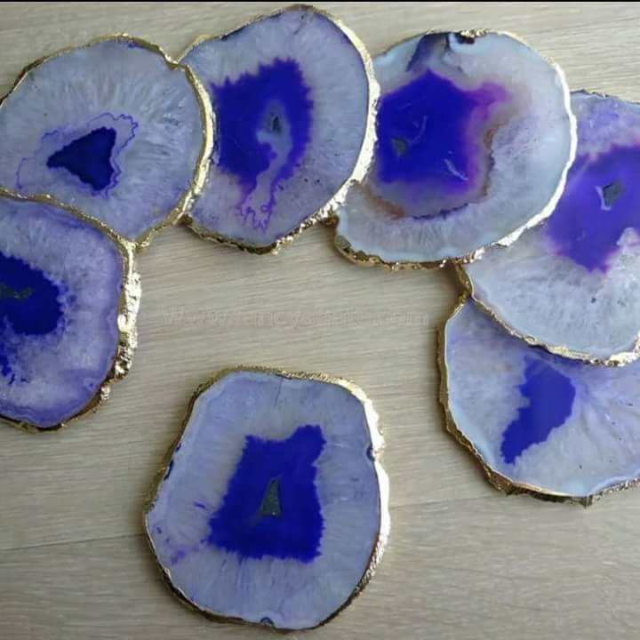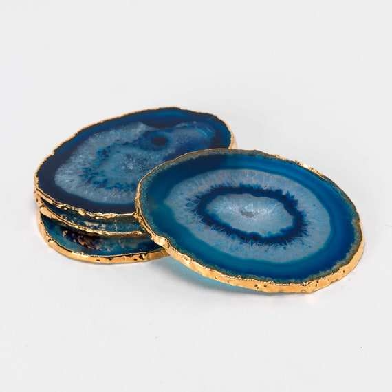 Los mejores posavasos pulidos de ágata azul con bordes electrochapados, rebanadas de amor de ágata natural curativa, posavasos de piedra de calidad superior