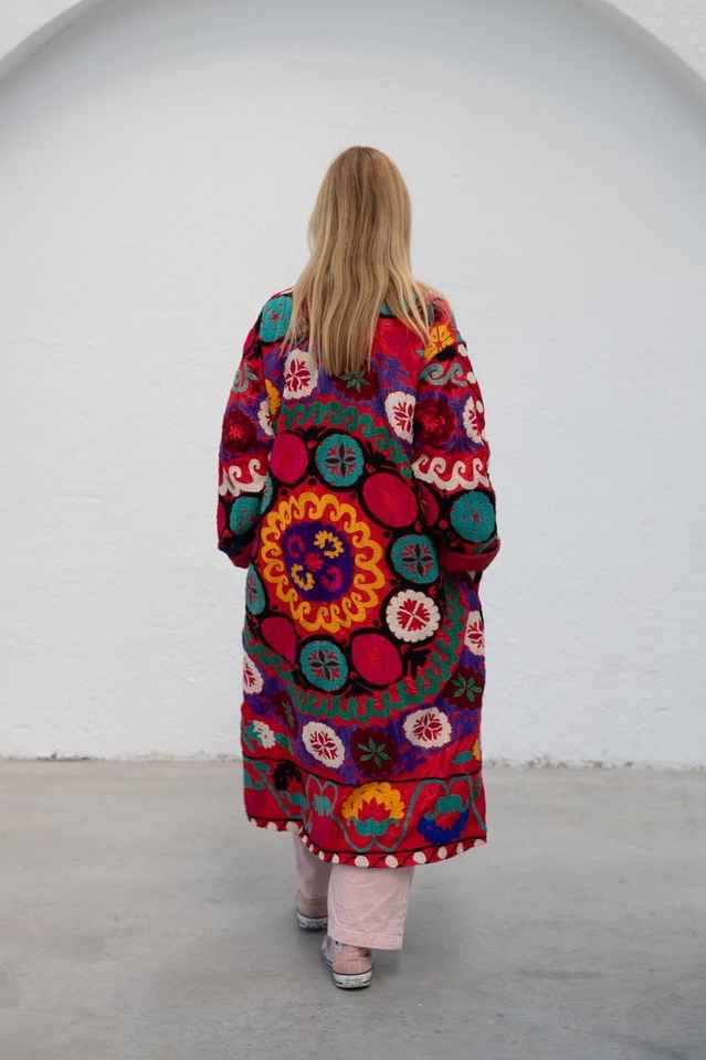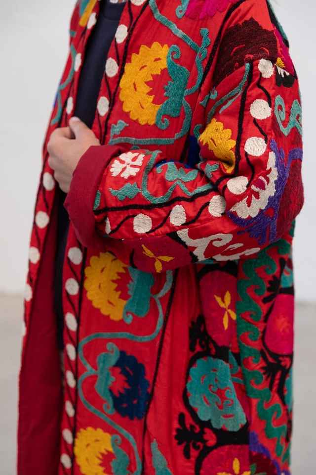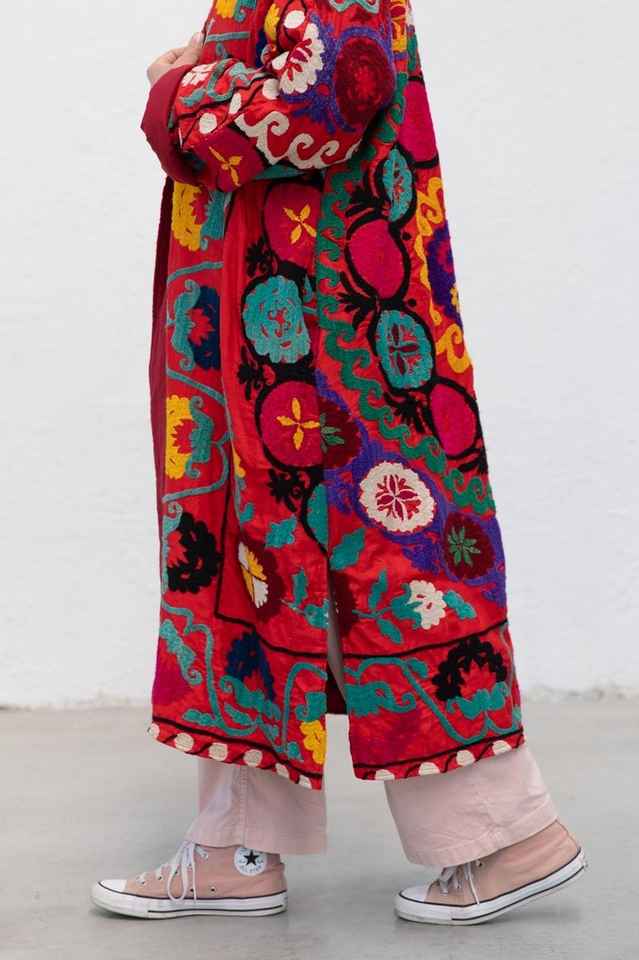 Chaqueta Acolchada Roja Extra Grande para Mujer, Hecha a Medida en Fábrica, Estilo Vintage, Acabado Suzani, Lona de Algodón