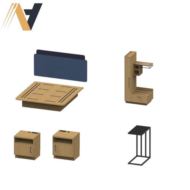 Juego de Muebles de Dormitorio de Hotel Moderno de Primera Calidad, Estilo Hampton Inn, Madera y Metal, Otomana, Cama California King/Queen, Apartamento, OEM/ODM, Vietnam