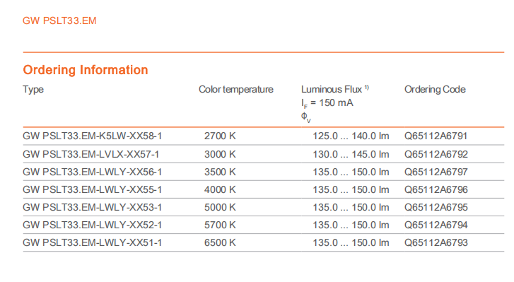 2700K, 3000K, 3500K, 4000K, 5000K, 5700K, 6500K