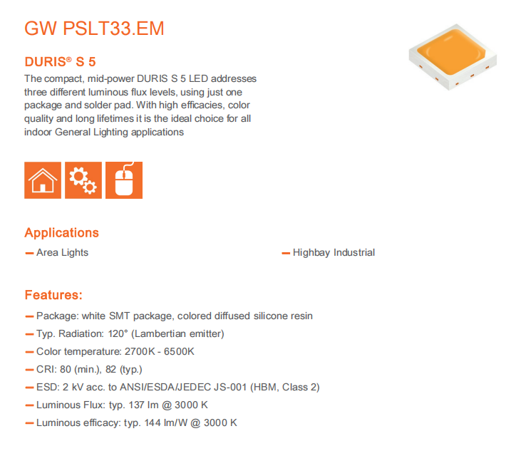 Mejor precio OSRAM DURIS S 5 GW PSLT33.EM Serie CRI80 138LM 0,96 W Led Smd Chip 3030 2700K-6500K Opcional