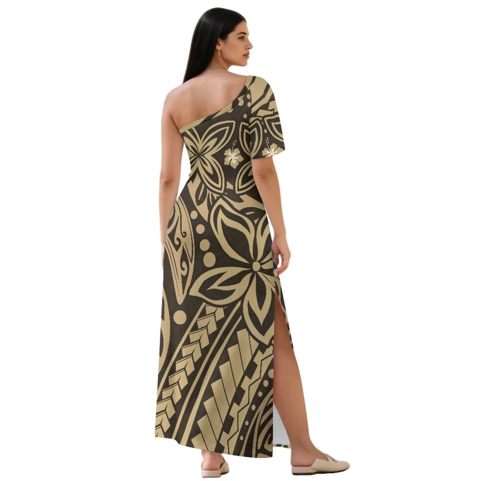 Mejor Precio al por mayor personalizado Samoan Tapa Puletasi vestido de las mujeres de una manga de un hombro de gran tamaño vestido largo dividido para las mujeres