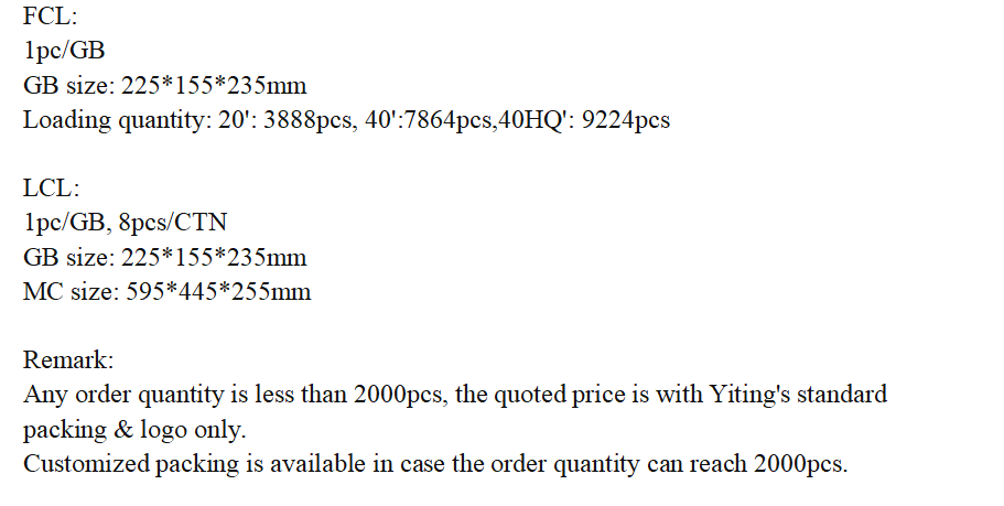 Observación: cualquier cantidad de pedido es inferior a 2000 Uds., el precio de cotización es solo con el embalaje y logotipo estándar de Yiting.