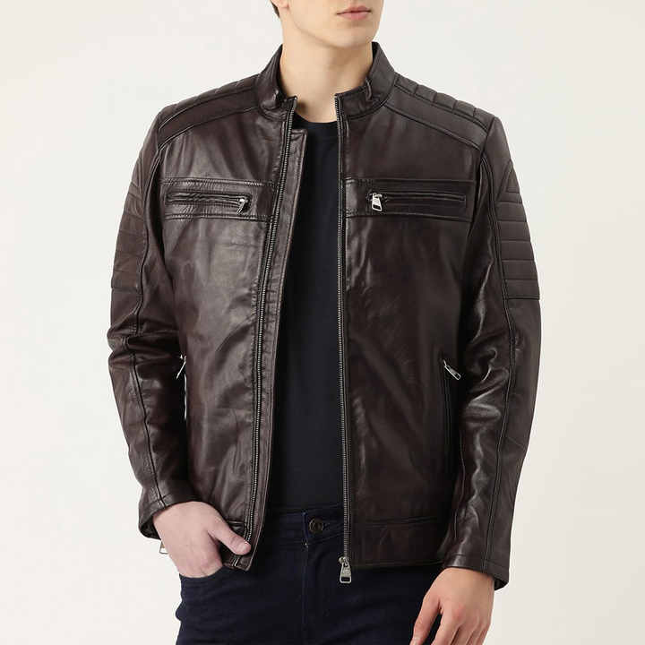 Salida de fábrica de la mejor calidad Venta caliente Chaqueta de cuero de motorista para hombres Chaqueta de cuero genuino de color único para hombres