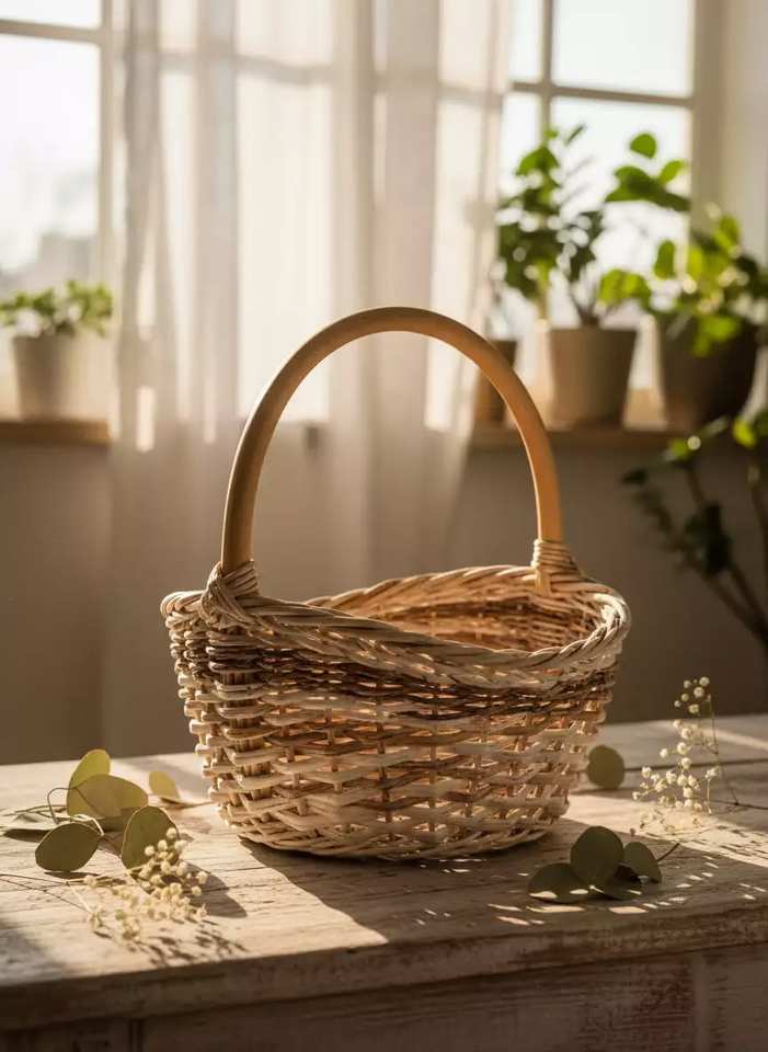 Cesta de ratán artesanal de la mejor calidad con asas para almacenamiento de frutas en la cocina y organización de artículos esenciales, colección hecha a mano.