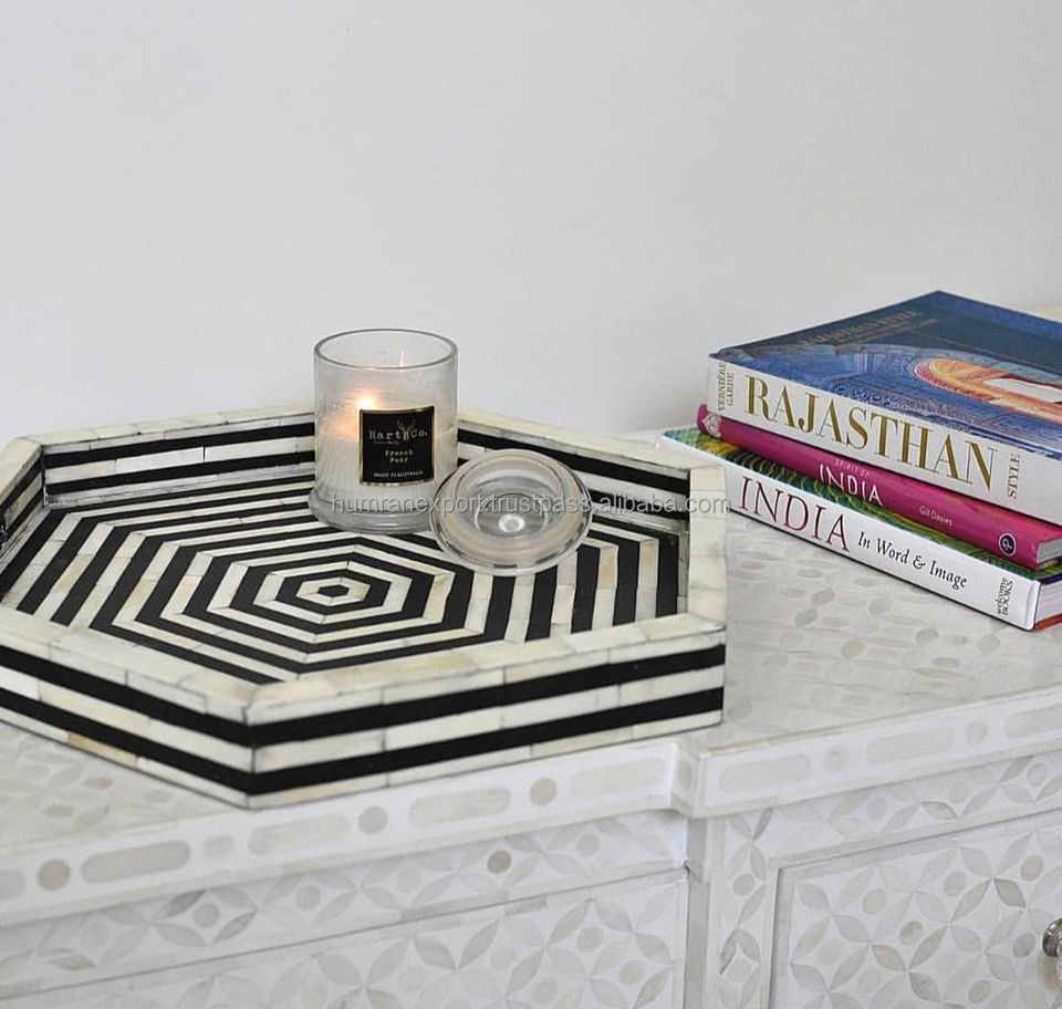 Tendencia Mejor calidad Hexagonal hecho a mano Incrustación de hueso Grado comercial Acabado pulido Bandeja de servicio India Textura floral personalizada