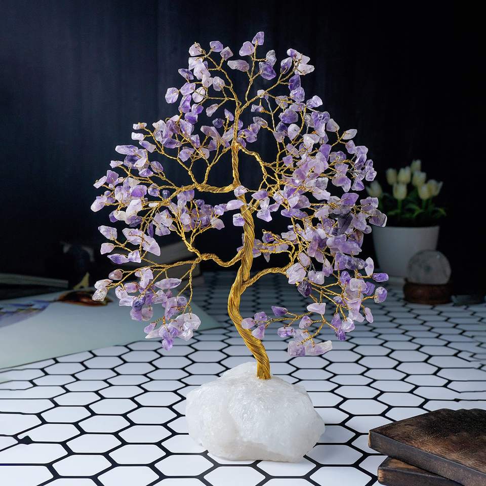 Gran oferta de la mejor calidad, árbol de cristal Natural, amatista, cristal, bonsái, árbol, cuentas de vida, piedras preciosas, Base de cuarzo rosa, forma de Navidad
