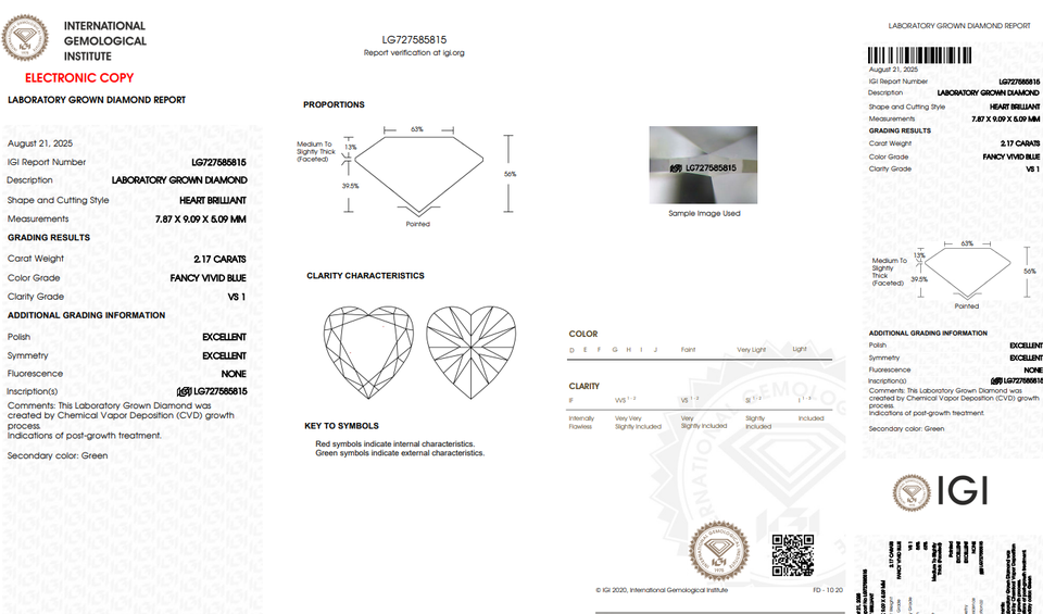 Diamantes sueltos cultivados en laboratorio de la mejor calidad, certificado IGI, corte de corazón azul vivo elegante, 2,17 CT, VS1, perforado con láser