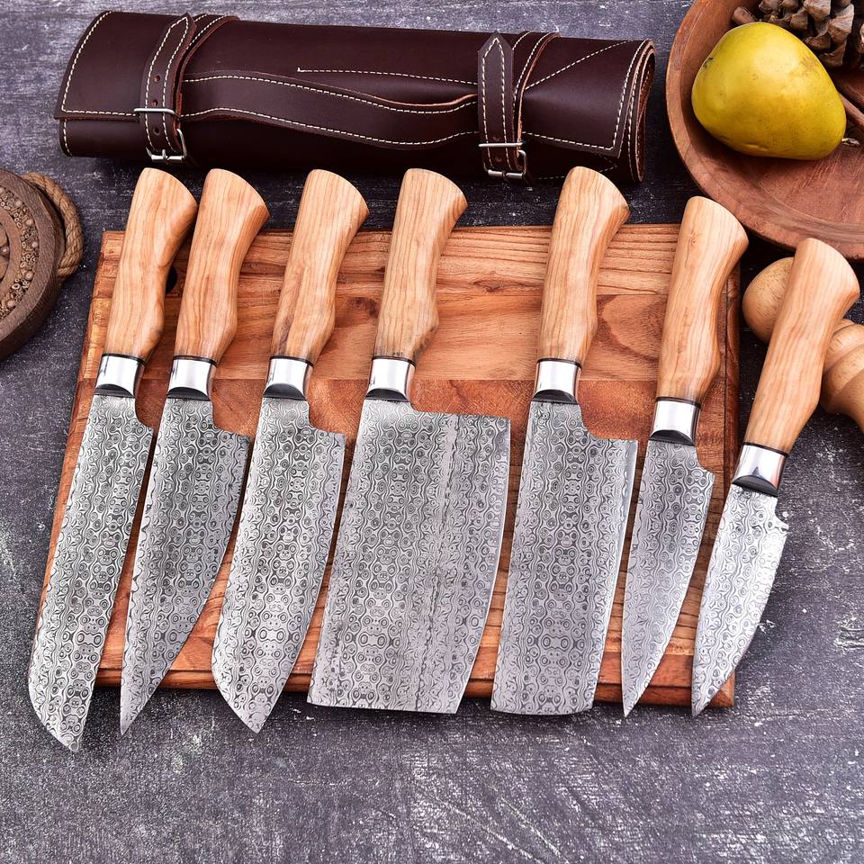 Juego de cuchillos de chef con mango de madera y hoja grabada