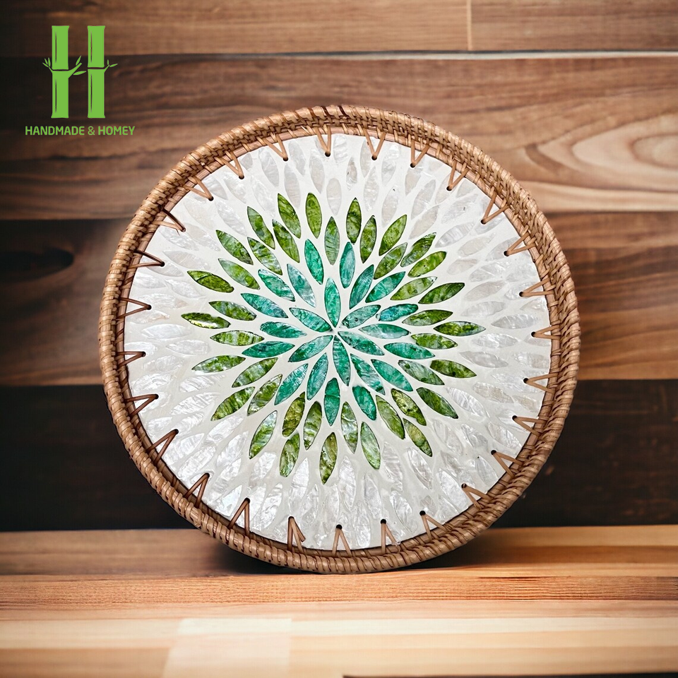 Bandeja de servicio duradera ecológica decorativa de ratán y nácar hecha a mano, diseño rústico para uso en el desayuno y la comida