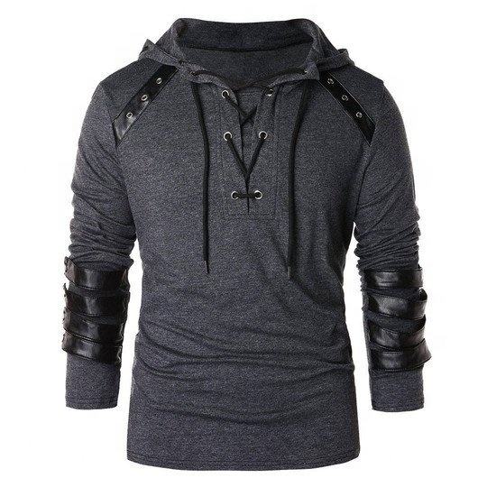 Sudadera con capucha de manga larga para hombre, con cordón de cuero, informal