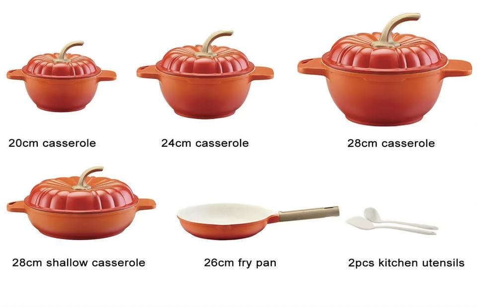 Juego de Ollas de Cocina con Forma de Calabaza, 9 Piezas, 20+24+28+28cm, Olla para Sopa + Sartén Antiadherente de Aluminio de 28cm, para Hogares Africanos, Más Vendido