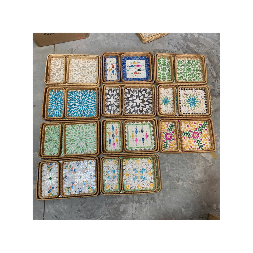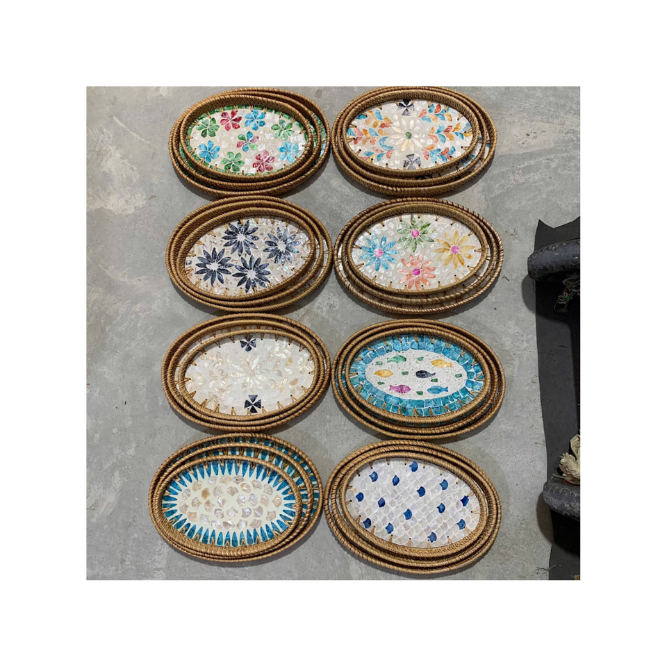 Bandeja Hexagonal de Ratán con Incrustaciones de Concha de Nácar Personalizable Más Vendida, Bandeja de Servicio con Patrón de Conchas Incrustadas, Artesanía en Oro 99
