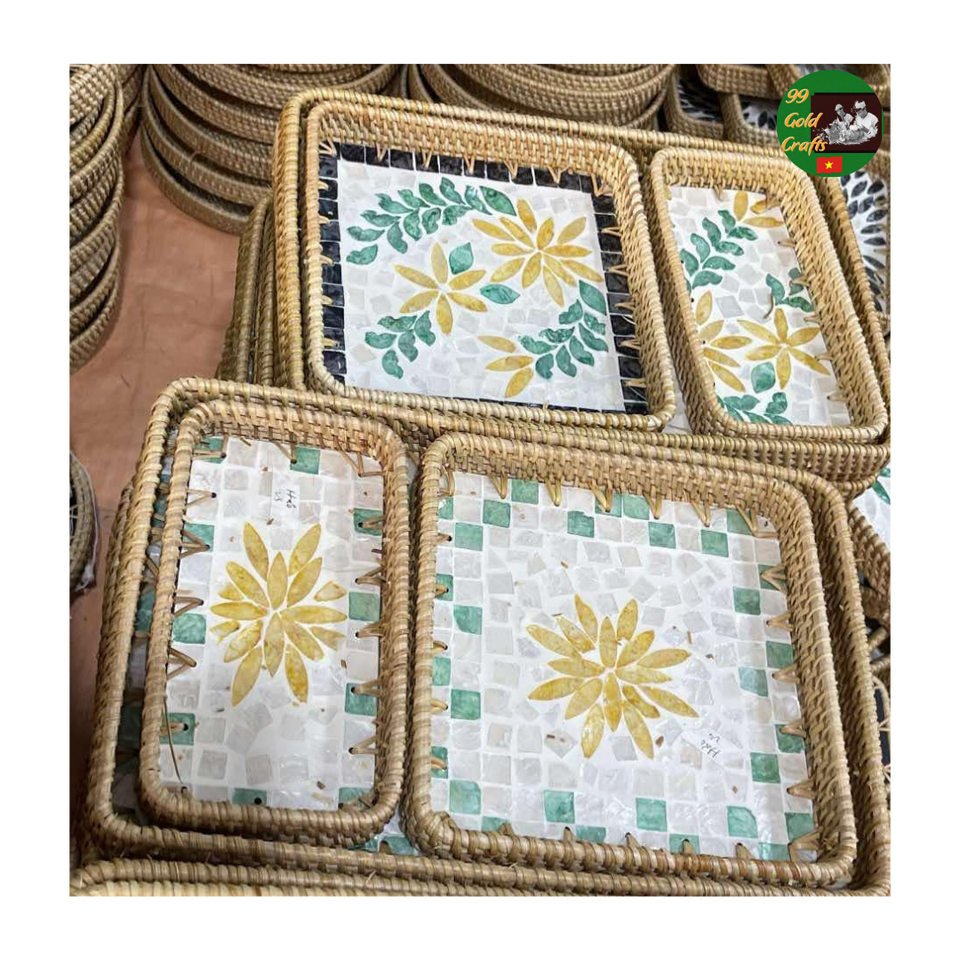 Bandeja de Servicio de Mimbre y Madreperla Más Vendida, Bandeja de Mimbre Natural Tejida a Mano para Decoración del Hogar y Venta al por Mayor