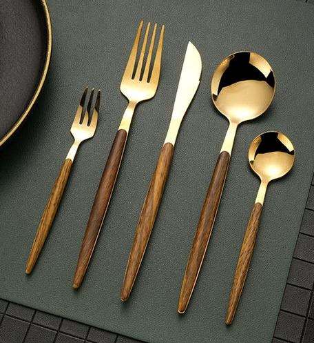 Productos más vendidos 2025 Juego de mesa de comedor Juego de cubiertos dorados Mango de madera ABS Tenedor de acero inoxidable Cuchara Cuchillo